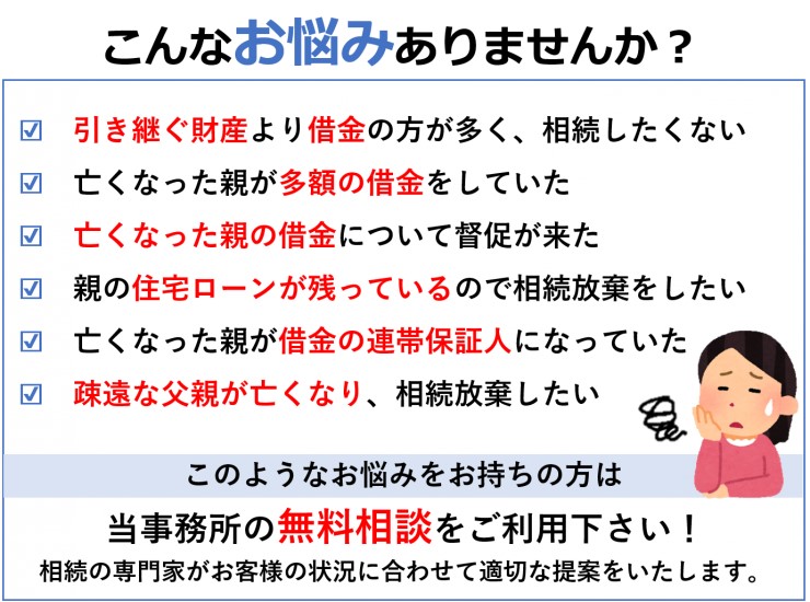借金の放棄や負債相続など相続放棄に関わるご相談は当事務所にお任せ下さい。