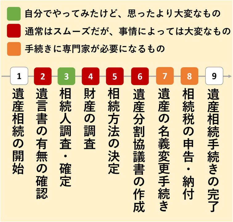 等々、様々な「”つまずき”ポイント」が分かってきました。これから相続手続きを進める方にとって分かりやすく色分けしてまとめてみました。