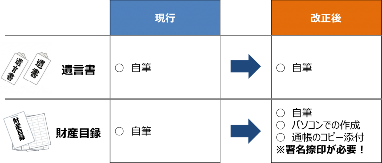 ただし、自筆証書に一体のものとして、自書によらない、財産の全部または一部を記載した財産目録(不動産登記事項証明書や預金通帳の写しも可)を添付することにより、自筆証書遺言を作成することができるようになりました。